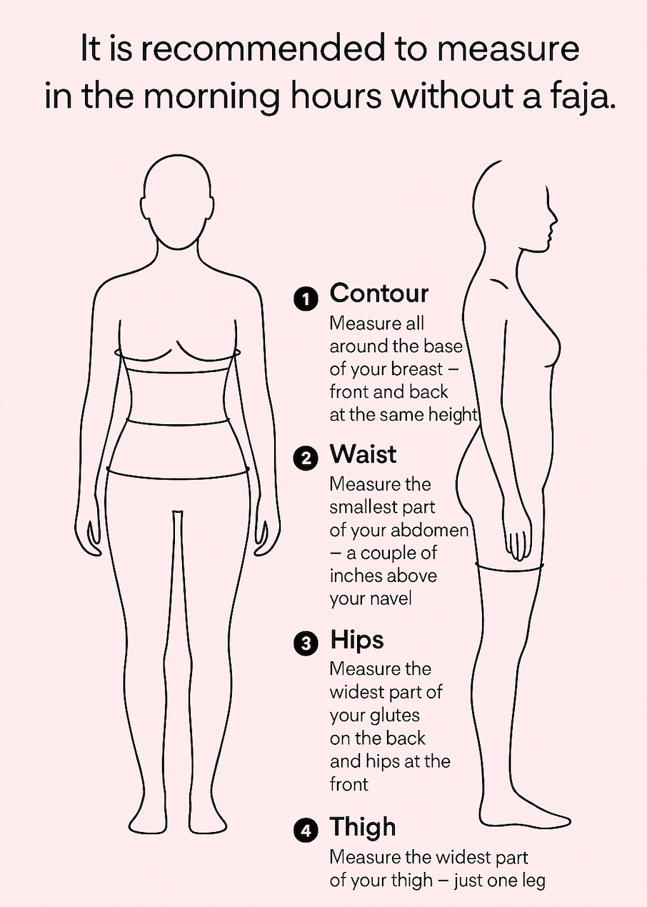 π Tip: Take your measurements in the morning hours when your body is naturally less swollen, and do not wear a faja while measuring.